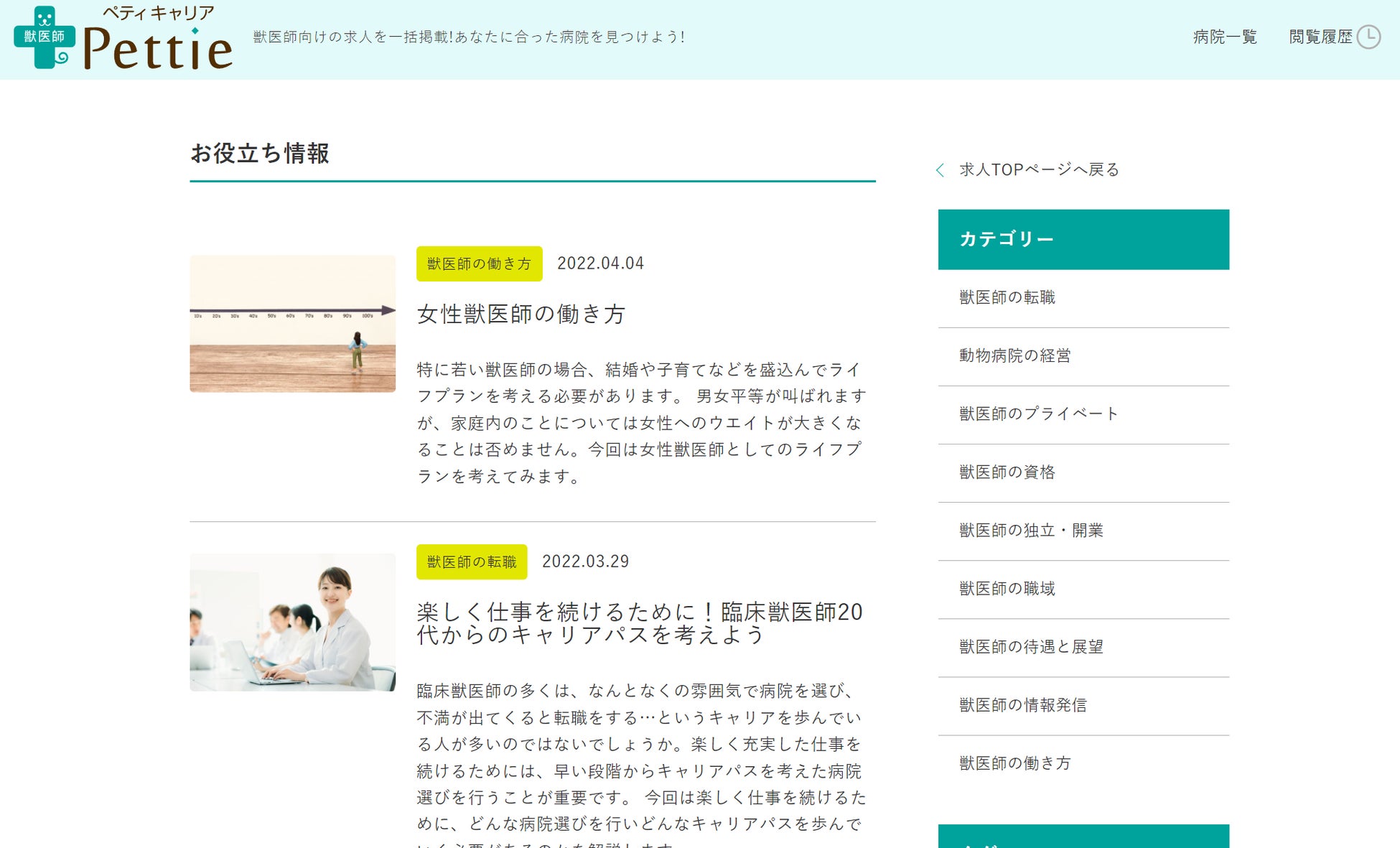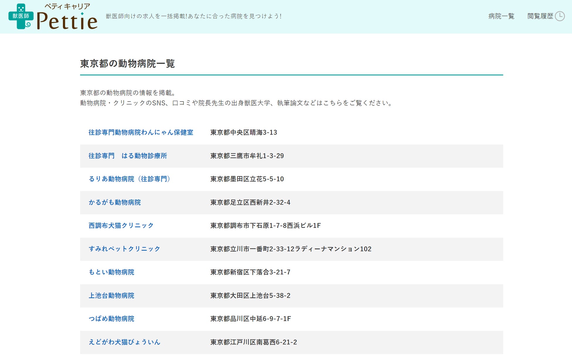 - Web上に掲載されている多数の獣医師の求人情報をPettieに集約